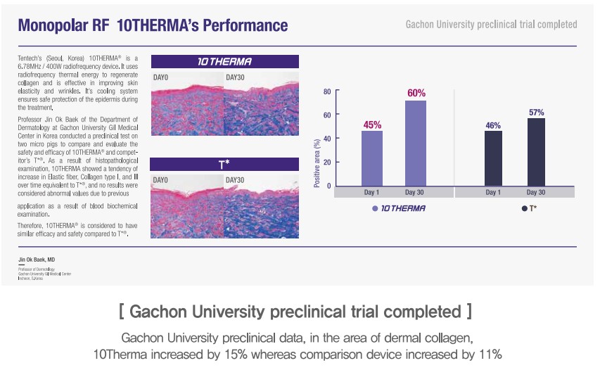 According to Tentech Inc., 10THERMA was initially launched in South Korea in October of last year. Within its first year, 10THERMA has already surpassed 500 units . 10THERMA, a 400W monopolar RF device with a 5㎠ tip size, boasts a treatment area 25% larger than other monopolar devices. Additionally, 10THERMA can deliver 20% more heat energy. One representative for Tentech Inc. said “Nowadays, People are much more interested in improving their skin than ever before. In the non-surgical skin tightening market industry, our product, 10THERMA, is rapidly gaining market share worldwide.” By acquiring approval from TFDA, Tentech Inc. has started to expand it influence in the global market. From Oct 8th to Oct 10th, Tentech Inc is going to participate in ‘The 49th Annual Meeting of Taiwanese Dermatological Association’, held at Kaohsiung Exhibition Center in Taiwan. This event is the first showcase for 10THERMA in Taiwan. Prof. Park (Eunsoo), of Soonchunhyang University, is going to deliver a lecture about 10THERMA, titled 'Monopolar RF Skin Tightening using innovative 10THERMA system.' He added “To enter Taiwan, we prepared well. We have already found and signed Taiwan export contract with one of leading distributerS in Taiwan.” And mentioned “We expect to sell at least 100 units in the Taiwanese market by the end of this year.” On the other hand, Tentech Inc. is planning to expand its presence in other key countries such as the U.S. and Brazil for 10THERMA. |
