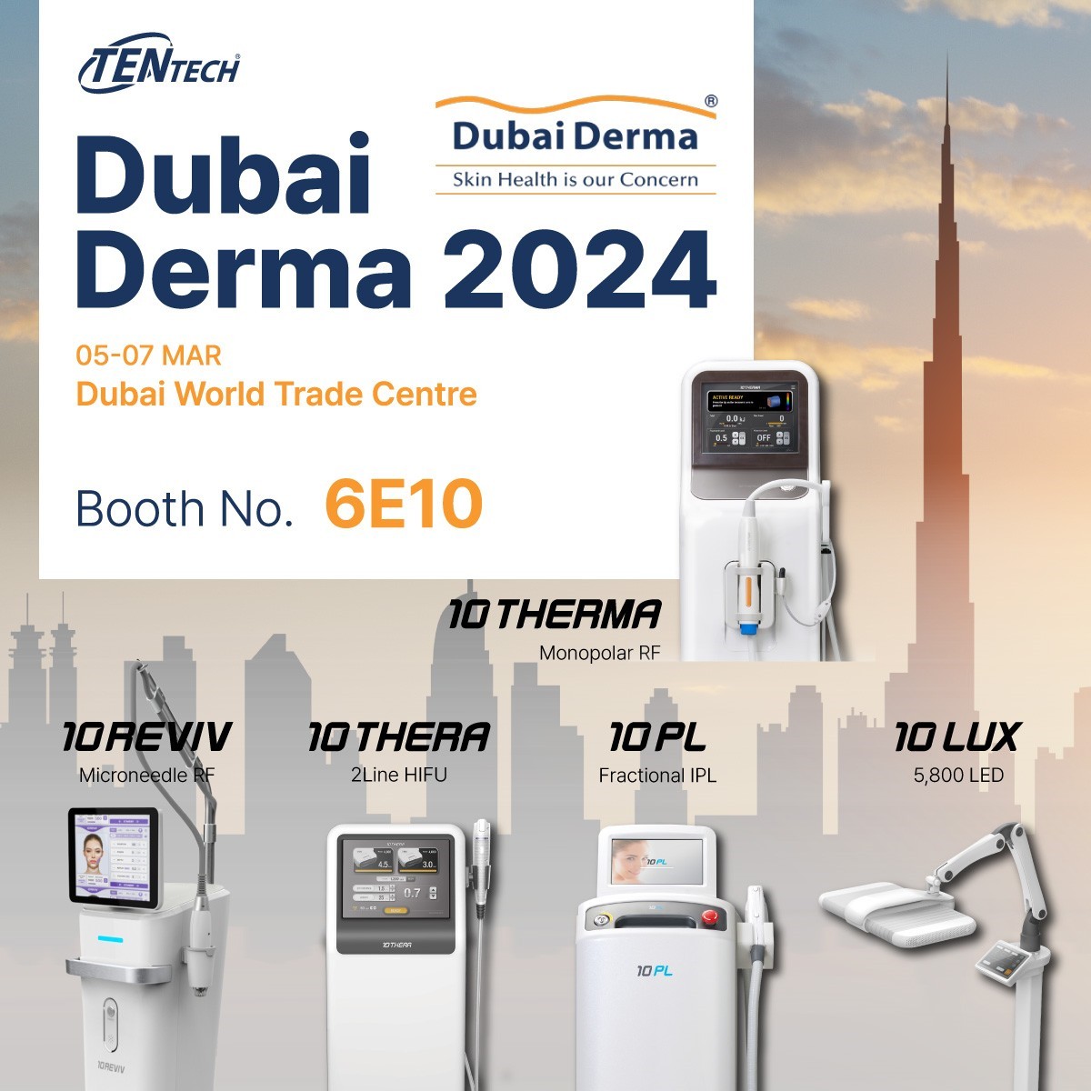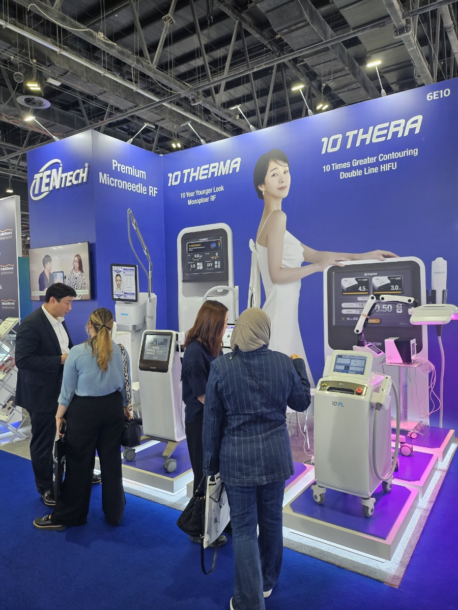 Dubai Derma has become the biggest event focused on scientific skincare in the Middle East, North Africa, and the Indian Subcontinent area. The event featured approximately 1440 brands and attracted approximately 24,000 visitors from 114 countries. 10THERMA is a monopolar radio-frequency (RF) device that penetrates deeply into the dermis by delivering RF heat energy. It can lead to collagen production through the recovery process from heat. This can help relieve various wrinkles such as forehead wrinkles, crow's feet, and fine lines, as well as increase skin elasticity, contributing to improvements in skin.10THERMA is equipped with the impedance matching technology that helps adjust precise targeted energy for the individual. Additionally, this treatment is one of the non-invasive treatments so this has no downtime and less pain. At Dubai Derma, Tentech Inc. showcased their products including '10THERMA' and '10THERA,' a 2-line irradiating HIFU (High-Intensity Focused Ultrasound) treatment device that generates heat in the dermis and SMAS layer. Additionally, they presented '10PL,' an IPL (Intense Pulsed Light) device utilizing fractional technology, '10LUX,' a device that boosts metabolic activity of mitochondria by irradiating LED light onto the skin, and '10REVIV,' a micro-needle RF device equipped with a cooling system. A Tentech official stated, "The Middle East has strong sunlight and a dry desert climate, making it prone to moisture evaporation from the skin." he added, "At the Dubai Derma exhibition in the Middle East, Tentech's innovative equipment received significant interest as attendees experienced it for the first time." |
